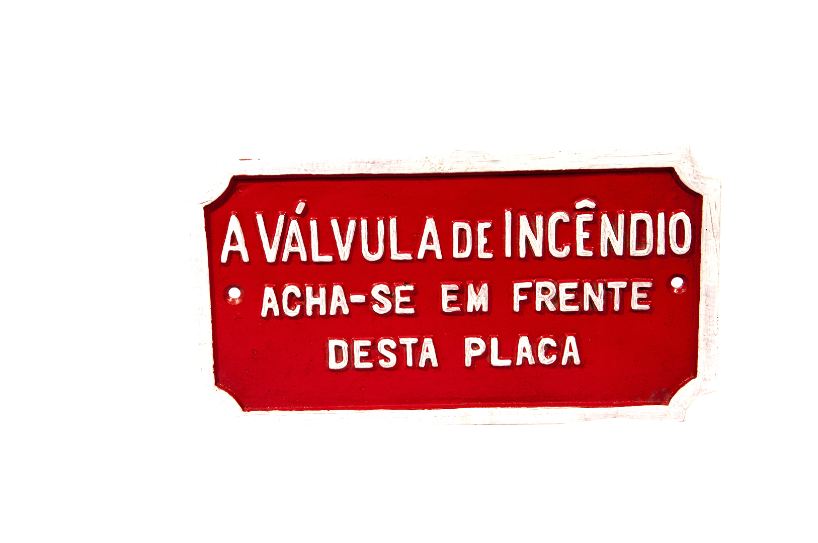 letras maiúsculas brancas, em fundo vermelho: “A VÁLVULA DE INCÊNDIO ACHA-SE EM